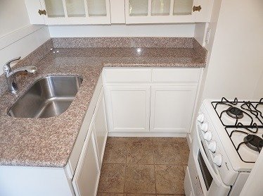 Kitchen includes granite countertops, gas stove, and new refrigerator.