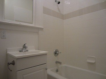 Bathroom has a shower over tub combination.